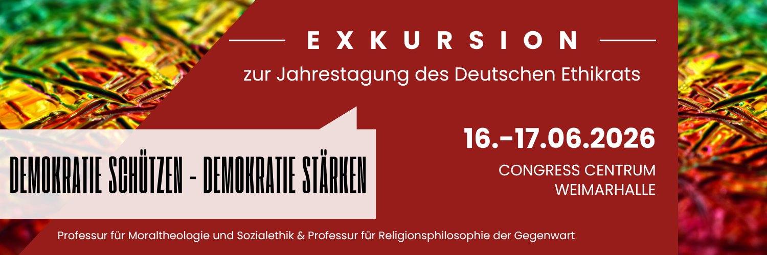 Auch in diesem Jahr organisiert die Professur für Moraltheologie und Sozialethik, gemeinsam mit der Professur für Religionsphilosophie der Gegenwart, eine Exkursion für Studierende zur Jahrestagung des Deutschen Ethikrats. Die Exkursion findet vom 16.-17.06.2026 in Weimar statt. Das diesjährige Tagungsthema lautet: Demokratie schützen - Demokratie stärken. Sei dabei und diskutiere mit!